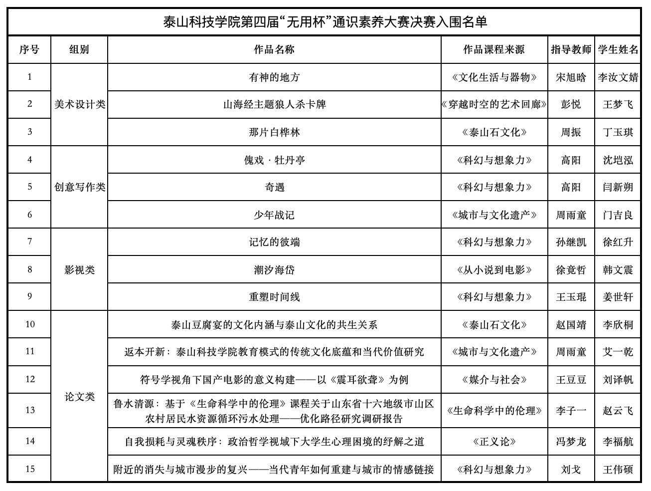 在经历了初赛与复赛的激烈角逐与严格评审后,第四届“无用杯”通识素养大赛现已圆满结束复赛阶段。自作品征集以来,大赛共收到500余份优秀投稿,经过层层选拔,最终有15份顶尖作品成功闯入决赛圈。其中,论文类6篇、美术设计类3份、影视类3份、创意写作类3篇,这些作品充分展现了我校学子卓越的思辨能力、创新意识与综合素养。