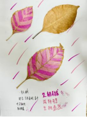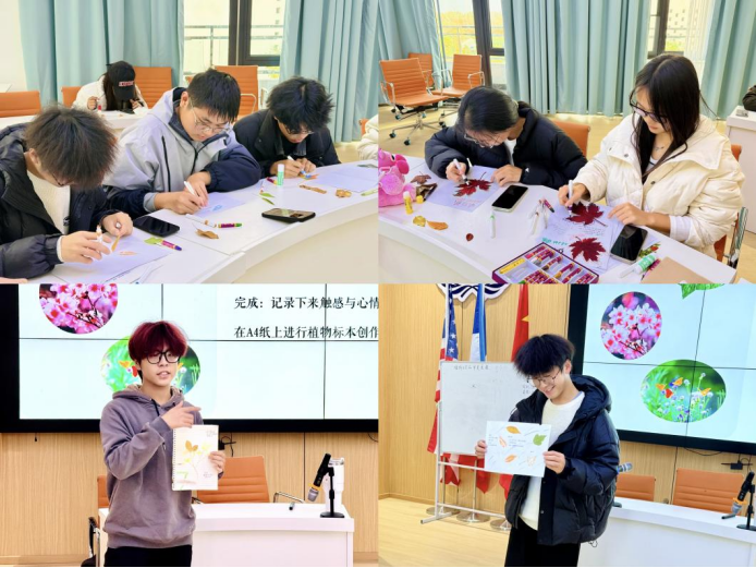课程最后环节为“叶片标本创作”。同学们在两位老师指导下,选取心仪叶片进行标本制作,不仅需标注植物信息,更要完成画面布局设计并撰写一段宣传语。这一环节将整堂课的观察、认知与思辨融会于动手实践,实现了“观察—学习—内化—表达”的完整学习闭环。
