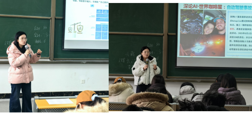 案例剖析环节成为课堂焦点。高姣姣老师选取美国特斯拉自动驾驶天价赔偿案与杭州“智驾神器”危险驾驶案进行深度解读,通过还原案件细节、拆解法律逻辑,引导学生思考不同场景下的责任划分原则。“同样是AI驾驶出事,为何一个车企担责,一个司机获刑?”。张雪教师则结合SAE自动驾驶分级标准,详细拆解两案中“车企担责”与“司机获刑”的本质差异,阐明当前我国智驾系统仍属辅助驾驶、驾驶人为最终责任主体的法律原则,同时还分享了深圳经济特区智能网联汽车管理条例等地方立法实践,展现“授权-监管-保险-问责”一体化解决方案的探索成果。帮助学生用不同的视角面对不同的事故,学会用法律维护自己的合法权益。