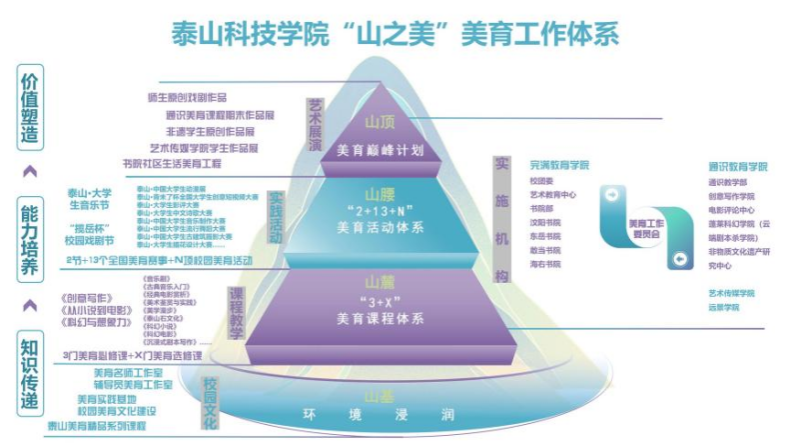 作为扎根泰山脚下的新型应用型大学,泰山科技学院“山之美”美育工作体系紧扣新时代美育要求,成立美育工作委员会,全面协调美育相关课程、活动、赛事,以“向上挺拔、向下扎根”为建设理念,将美育教育深度融入学校“四位一体双院制”人才培养体系。