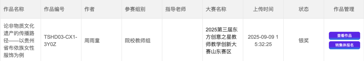 近日,2025年第三届东方创意之星教师教学创新大赛山东赛区获奖名单揭晓。通识教学部的周雨童老师凭借论文《论非物质文化遗产的传播路径——以贵州省布依族女性服饰为例》,在赛事中表现突出,成功荣获山东赛区银奖。