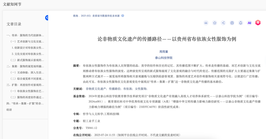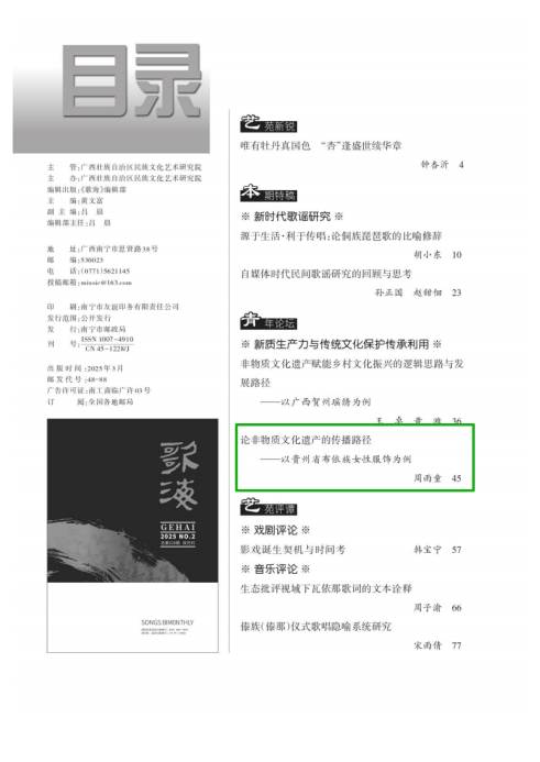 该获奖论文于2025年7月发表于广西壮族自治区民族文化艺术研究院主办的期刊《歌海》(双月刊)的“青年论坛”版块,全文共计12版面,依托教育部社科司中华优秀传统文化专项课题进行深入研究。论文以贵州省布依族女性服饰为具体案例,系统分析了非物质文化遗产的传播机制,创新性地提出了“传承—集聚—扩散”的非遗传播基本路径,为非物质文化遗产的保护与传播提供了重要的理论参考与实践思路。