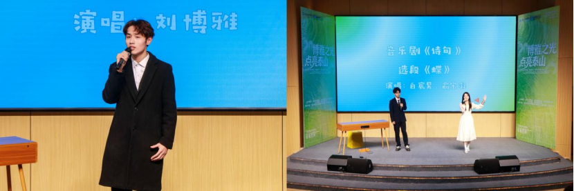 第三幕“剧场的咏叹”聚焦《音乐剧》课程成果,将音乐的叙事性与表演的感染力完美结合。刘博雅演唱的音乐剧《金沙》选段《天边外》,以清澈醇厚的嗓音演绎出角色的深情与怅惘,精准传递出音乐剧的情感内核;白宸昊与俞宋凝合作的《蝶》选段《诗句》,则通过默契的和声与情感互动,展现了音乐剧“声情合一”的艺术特质。两位同学的演绎不仅体现了对声乐技巧的掌握,更展现了通识课程在培养学生情感表达与舞台表现力方面的显著成效,让美育在沉浸式表演中落地生根。