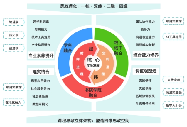 《中国近现代经济地理》课程是我校通识教育学院面向全校学生所开设的通识选修课,其目的在于引导学生了解国家近现代经济变迁,进而增强学生的历史使命感与社会责任感。课程内容以中国东、中、西及东北部的空间进程为“经”,以中国近现代史的时间进程为“纬”,构建起经纬交织、脉络清晰的课程时空体系,具备历史学、地理学、经济学多学科融合的深厚基础。通过深入剖析经济地理格局的演变,教会学生从历史维度认识国家发展的脉络,培养学生宏观视野与战略思维。该课程着重将思政元素与专业知识进行有机融合,使学生在掌握经济地理知识的同时,树立正确的世界观、人生观、价值观。在“大思政课”这一新时代创新性思想政治教育模式的引领下,该课程以小见大,借助小课程撬动大思政,构建“一核·双线·三融·四维”的立体思政架构,避免思政元素的生搬硬套与生硬嵌入,力求使思政教育如盐溶于水般,润物无声。思政教育的触角延伸至课程的各个维度。