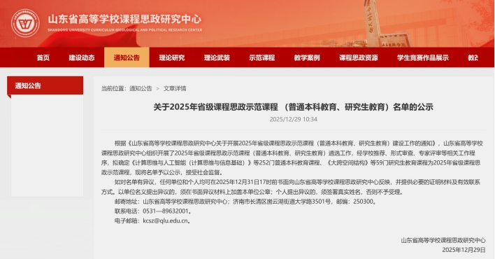 近日,山东省教育厅公布了2025年省级课程思政示范项目认定结果。在全省69所高校(含山东大学、哈尔滨工业大学(威海)等),300余门参评课程的激烈角逐中,我校通识课程《中国近现代经济地理》凭借鲜明的价值导向与卓越的育人成效脱颖而出,成功获评“2025年山东省课程思政示范课程”,实现了学校省级课程建设成果的再突破!《中国近现代经济地理》是通识教育学院继《生活中的经济学》获批省级课程思政示范课后的又一突破,是学校优质通识课程建设的再突破。